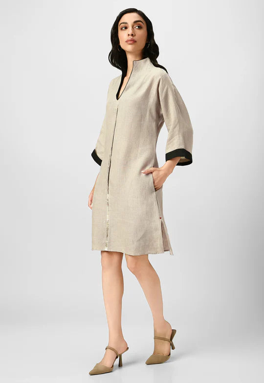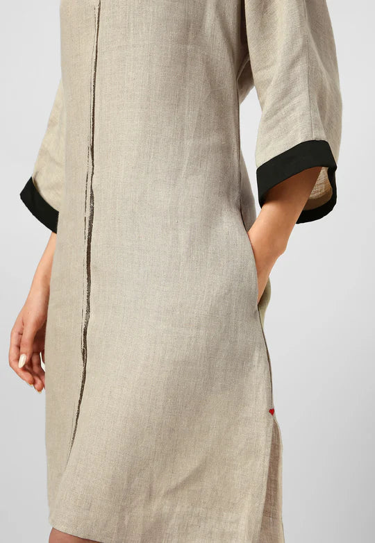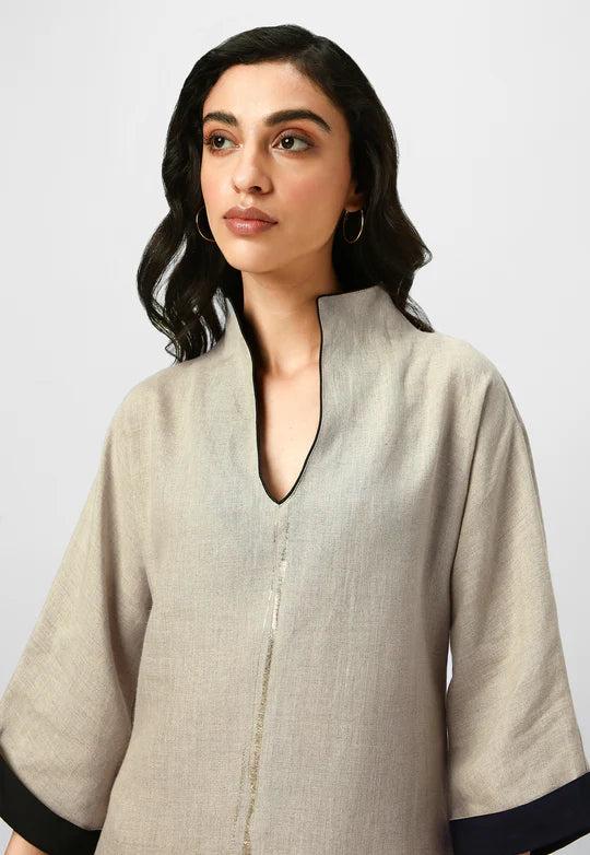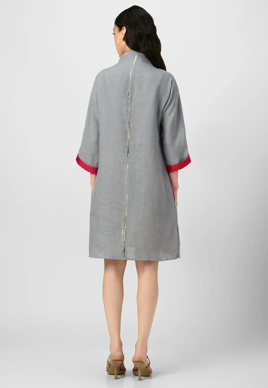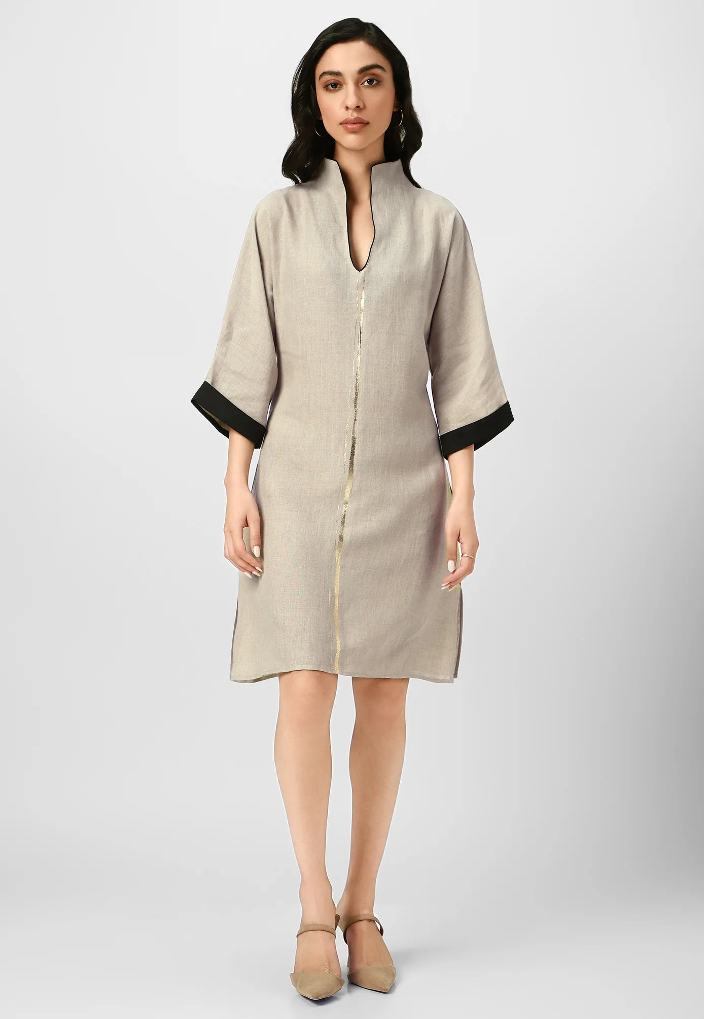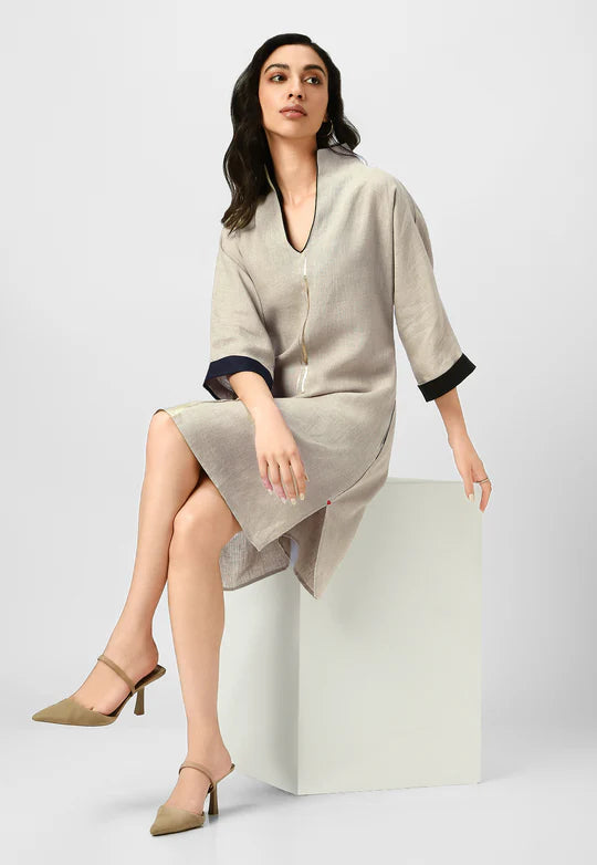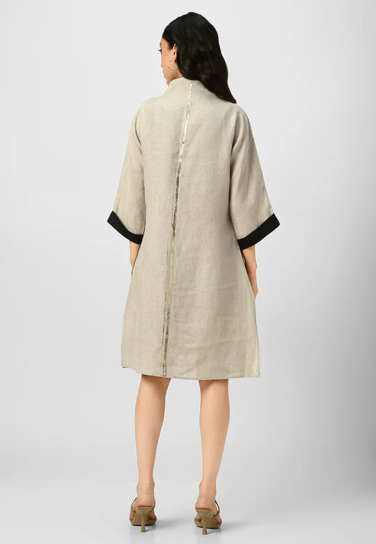 A masterpiece of understated luxury, this dress features elegant gilded detailing along the edges, catching the light like twilight on gold. Crafted from flowy, breathable fabric with a structured yet relaxed silhouette, it blends modern artistry with timeless grace. The Mrin Edition reimagines classic cuts with a contemporary glow, making it perfect for soirées, festive gatherings, or elevated everyday moments.