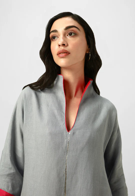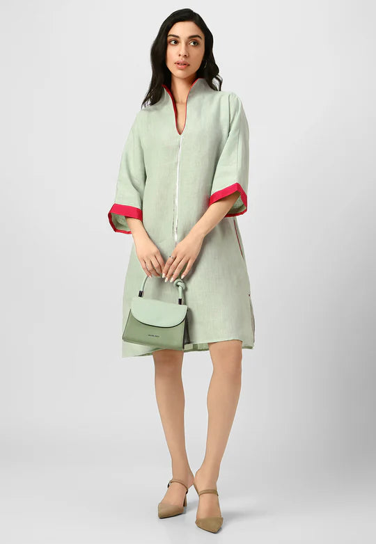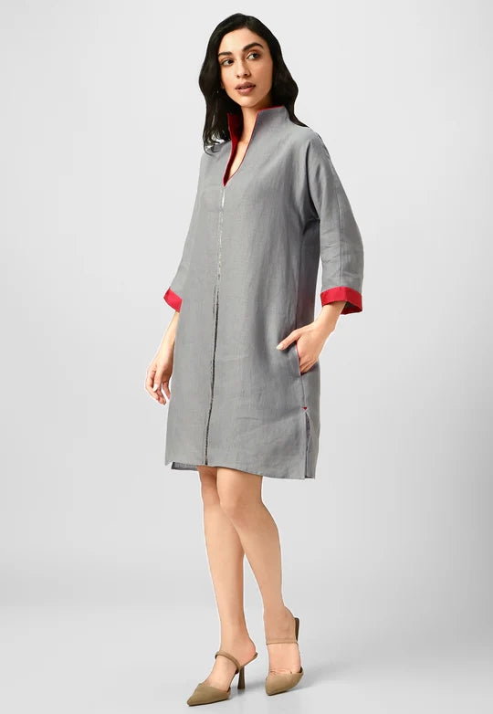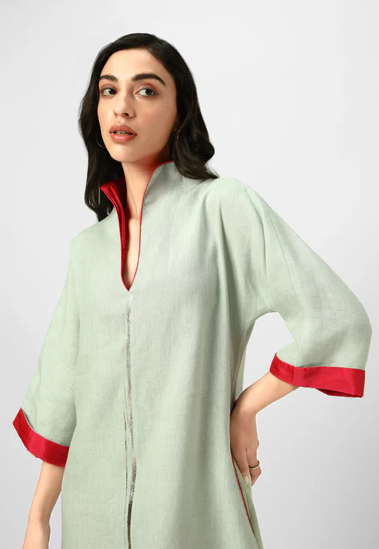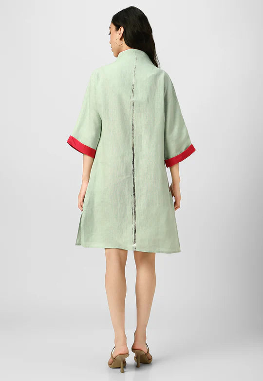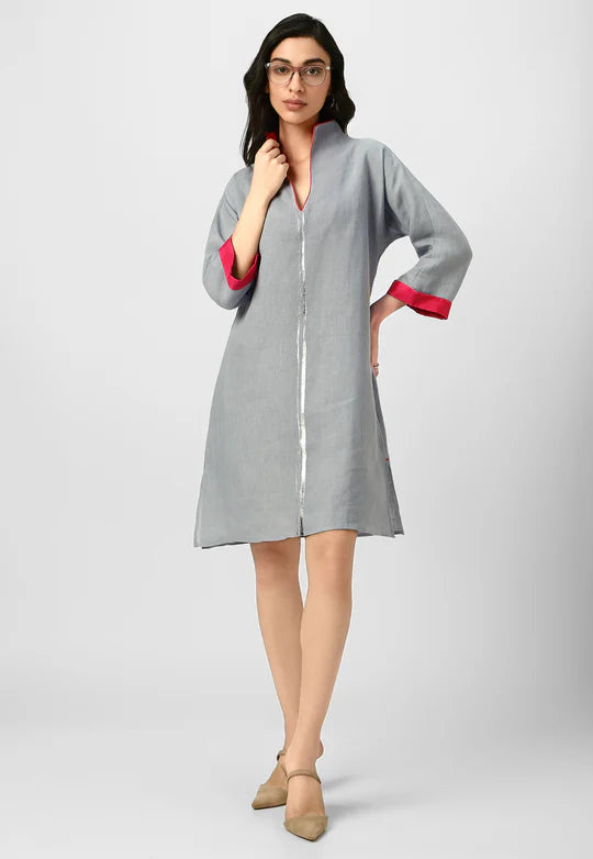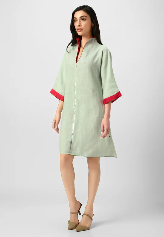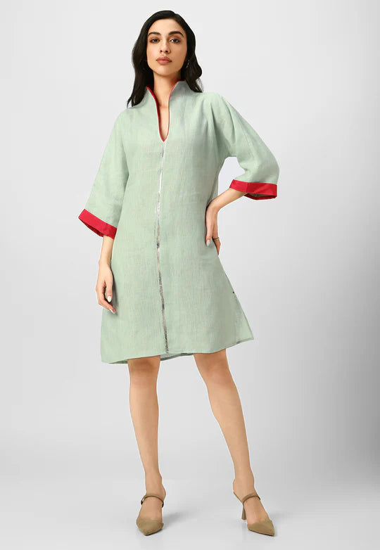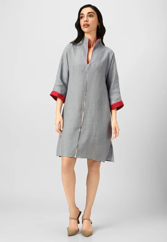 A masterpiece of understated luxury, this dress features elegant gilded detailing along the edges, catching the light like twilight on gold. Crafted from flowy, breathable fabric with a structured yet relaxed silhouette, it blends modern artistry with timeless grace. The Mrin Edition reimagines classic cuts with a contemporary glow, making it perfect for soirées, festive gatherings, or elevated everyday moments.