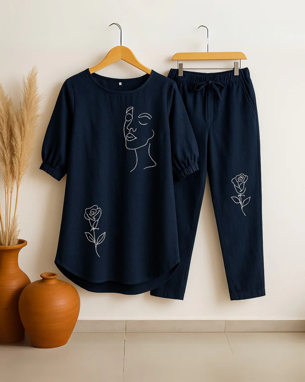 👗 Easy Silhouette: The relaxed-fit top and matching trousers offer free movement and day-long ease.